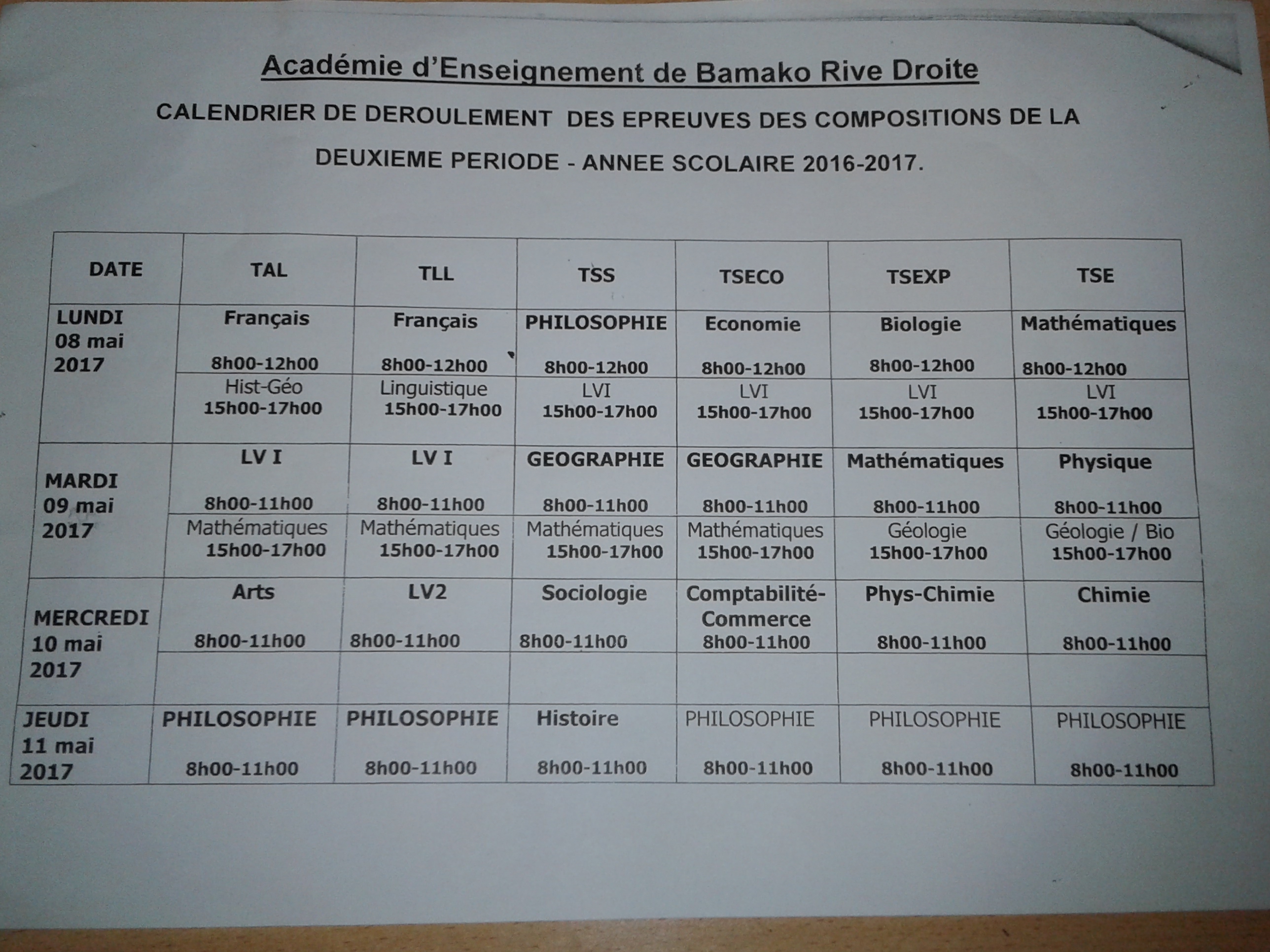 CALENDIER DES DEROULEMENT DES EPREUVES DES COMPOSITIONS DE LA DEUXIEME PERIODE 2016 – 2017